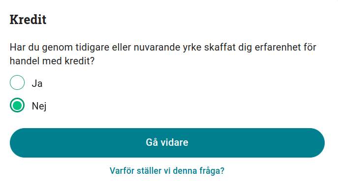 Fråga 3: Har du genom tidigare eller nuvarande yrke skaffat dig erfarenhet för handel med kredit?