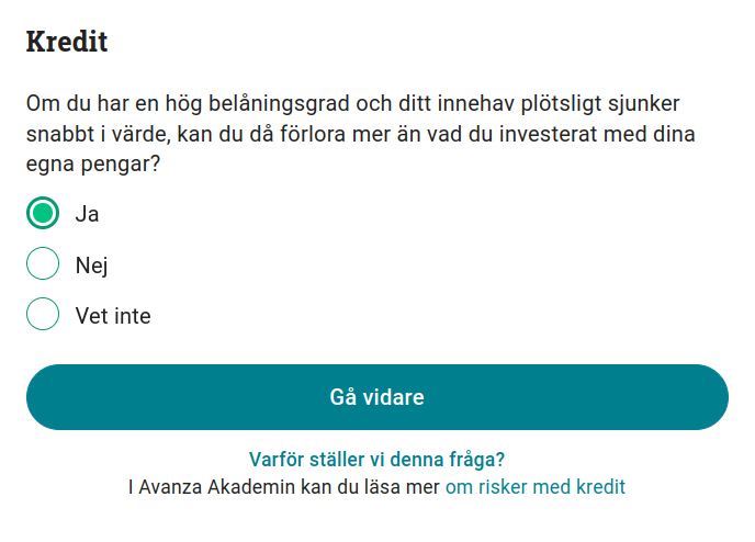 Fråga 5: Om du har en hög belåningsgrad och ditt innehav plötsligt sjunker snabbt i värde, kan du då förlora mer än vad du investerat med dina egna pengar?