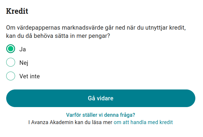 Fråga 11: Om värdepappernas marknadsvärde går ned när du utnyttjar kredit, kan du då behöva sätta in mer pengar?